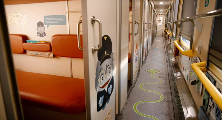 Як повідомили в компанії, вагони обладнано з урахуванням потреб маленьких пасажирів: тут встановлено додаткові поручні на рівні зросту дитини, захисні елементи на верхніх полицях, сповивальні столики та відкидні сидіння в санвузлах, манежі для сну й підігрівачі дитячого харчування. Також передбачено дитяче меню – наприклад, сирники або нагетси з гречкою. Для зручності сімей з колясками додано складні пандуси.