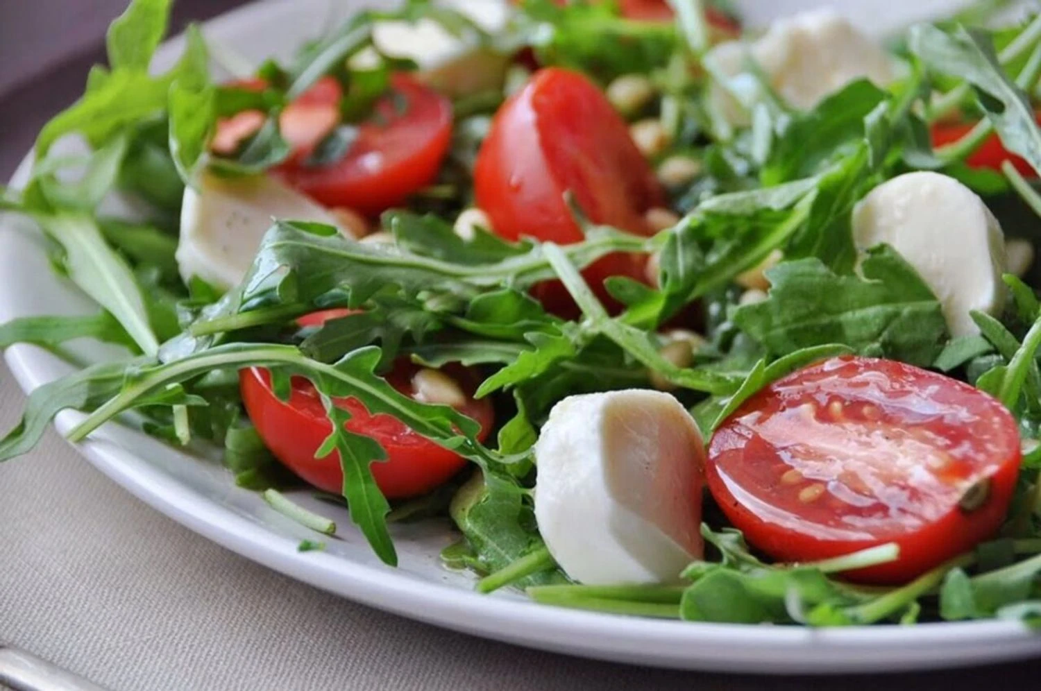 - Збоку викладіть руколу, шматочки айсберга та нарізаний помідор;