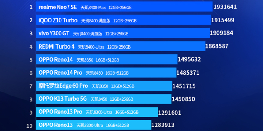 Лідером списку став Realme Neo 7 SE з процесором Dimensity 8400-Ultra, який набрав у середньому 1 931 641 бал. На другій і третій позиціях розташувалися iQOO Z10 Turbo та Vivo Y300 GT зі стандартною версією Dimensity 8400 — їхні результати становили 1 915 499 та 1 909 184 бали відповідно.