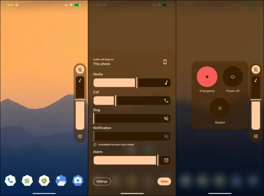 На прикладі повзунка гучності видно, що розробники Android вирішили відмовитися від суцільних світлих і темних підкладок на користь напівпрозорого «матеріалу». Він підлаштовується під динамічні кольори, а також крізь нього можуть просвічуватися шпалери робочого столу. Водночас змінився значок контекстного меню на панелі регулювання гучності: замість трьох крапок тепер використовується наочніша іконка.