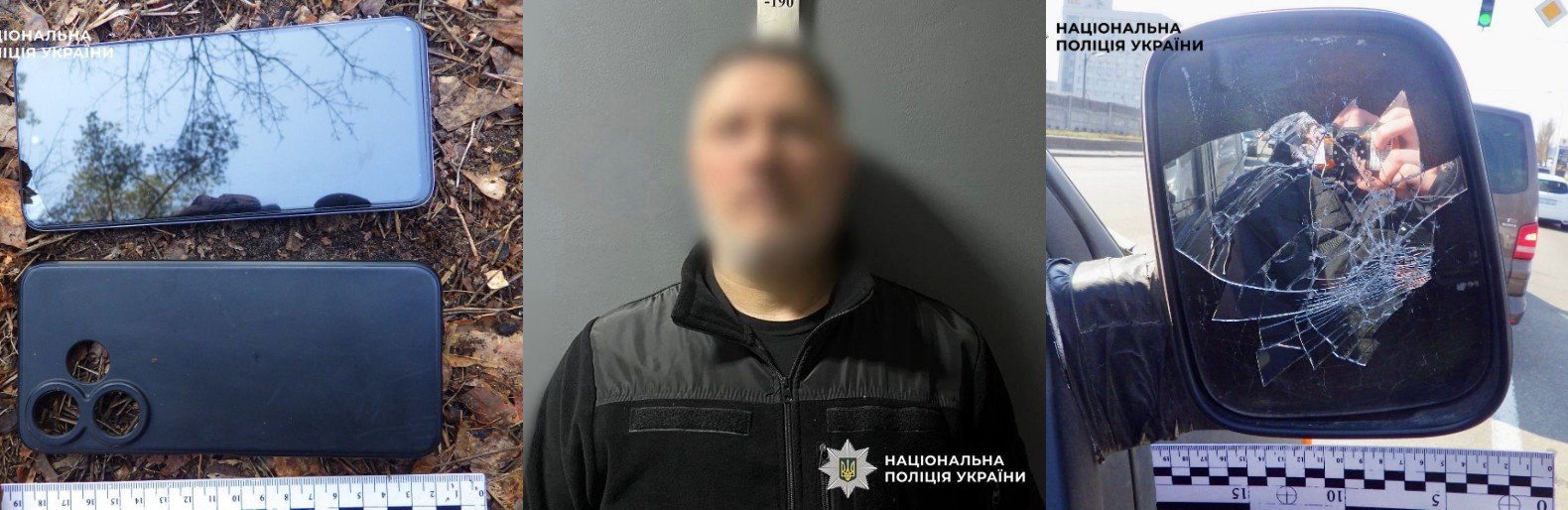 Зловмисник пошкодив автомобіль потерпілого, розбивши дзеркало, а також відібрав у нього мобільний телефон. За скоєне, як повідомили у відділі комунікацій поліції Києва, йому загрожує до десяти років позбавлення волі.