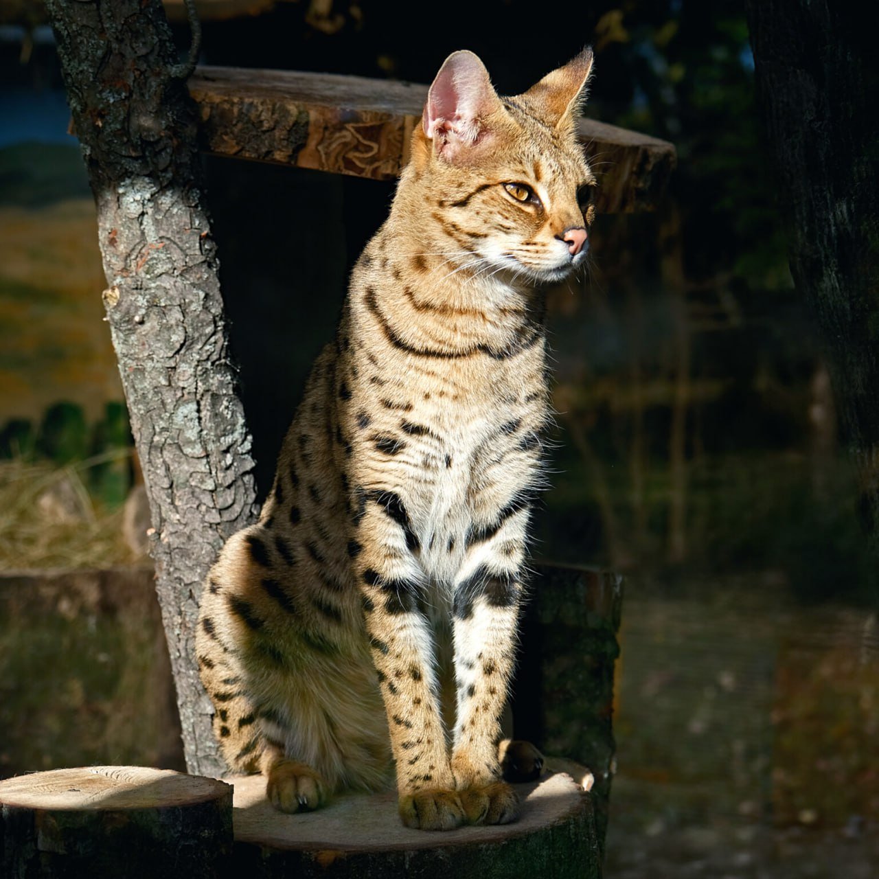 - Сервал — кішка з Африки, відома своїми довгими лапами та стрибками до трьох метрів у висоту. Її рухи — точні й граційні, як у справжнього мисливця.