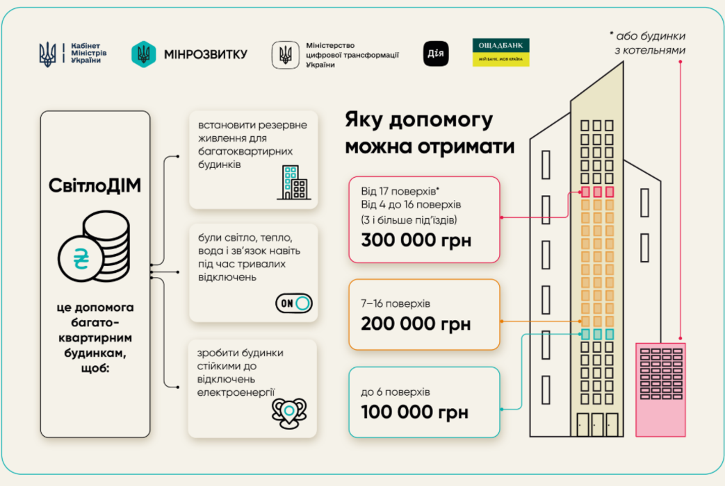 - Програма «СвітлоДім» створена для мешканців багатоквартирних будинків, яка передбачає надання від 100 до 300 тис. грн на придбання генератора інверторів акумуляторів та сонячних панелей для забезпечення безперебійного електропостачання.