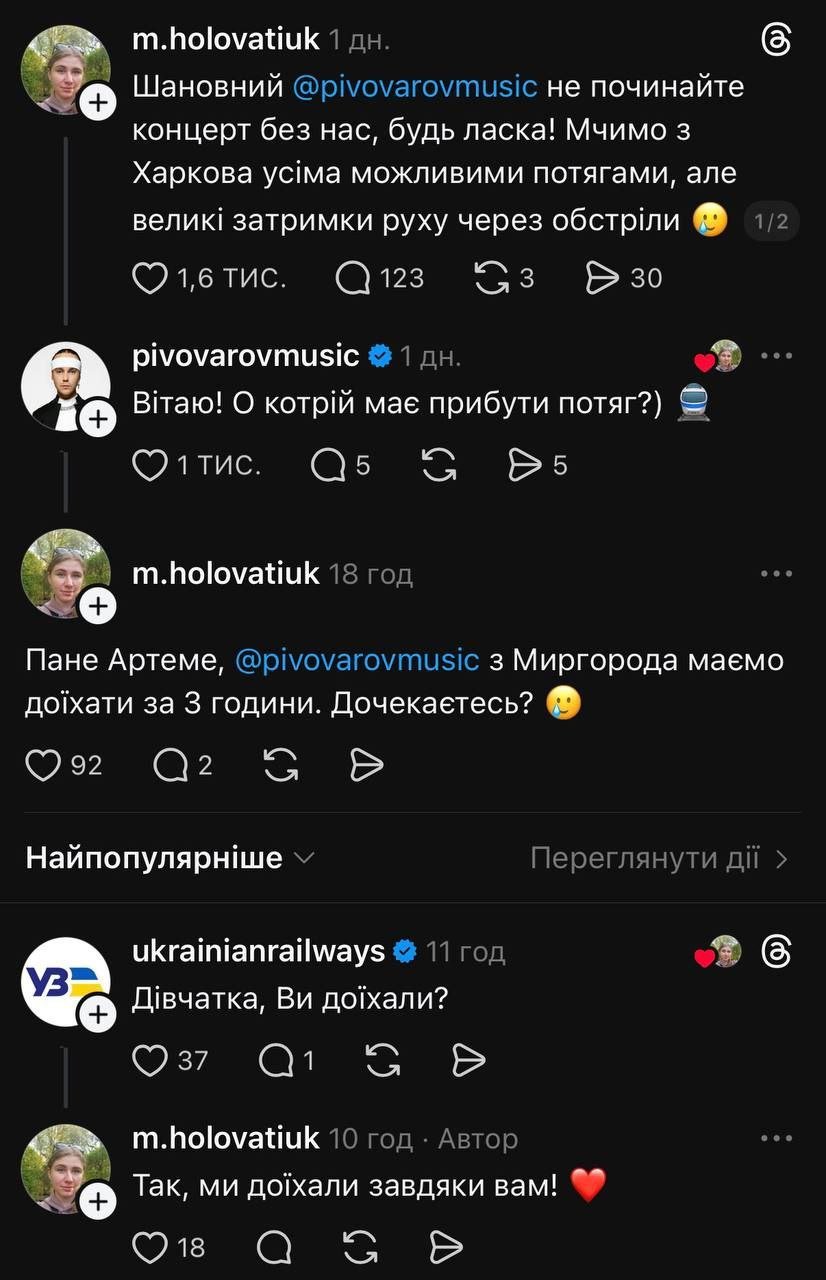 Попри масовані російські обстріли, які спричинили значні затримки поїздів по всій країні, справжня історія людяності та єдності розгорнулася у соціальних мережах, об'єднавши фанатів, артиста та національного перевізника. Відомий співак Артем Пивоваров особисто відгукнувся на заклик шанувальників, які не встигали на його концерт у столичному «Палаці спорту» через запізнення поїзда Харків — Київ.