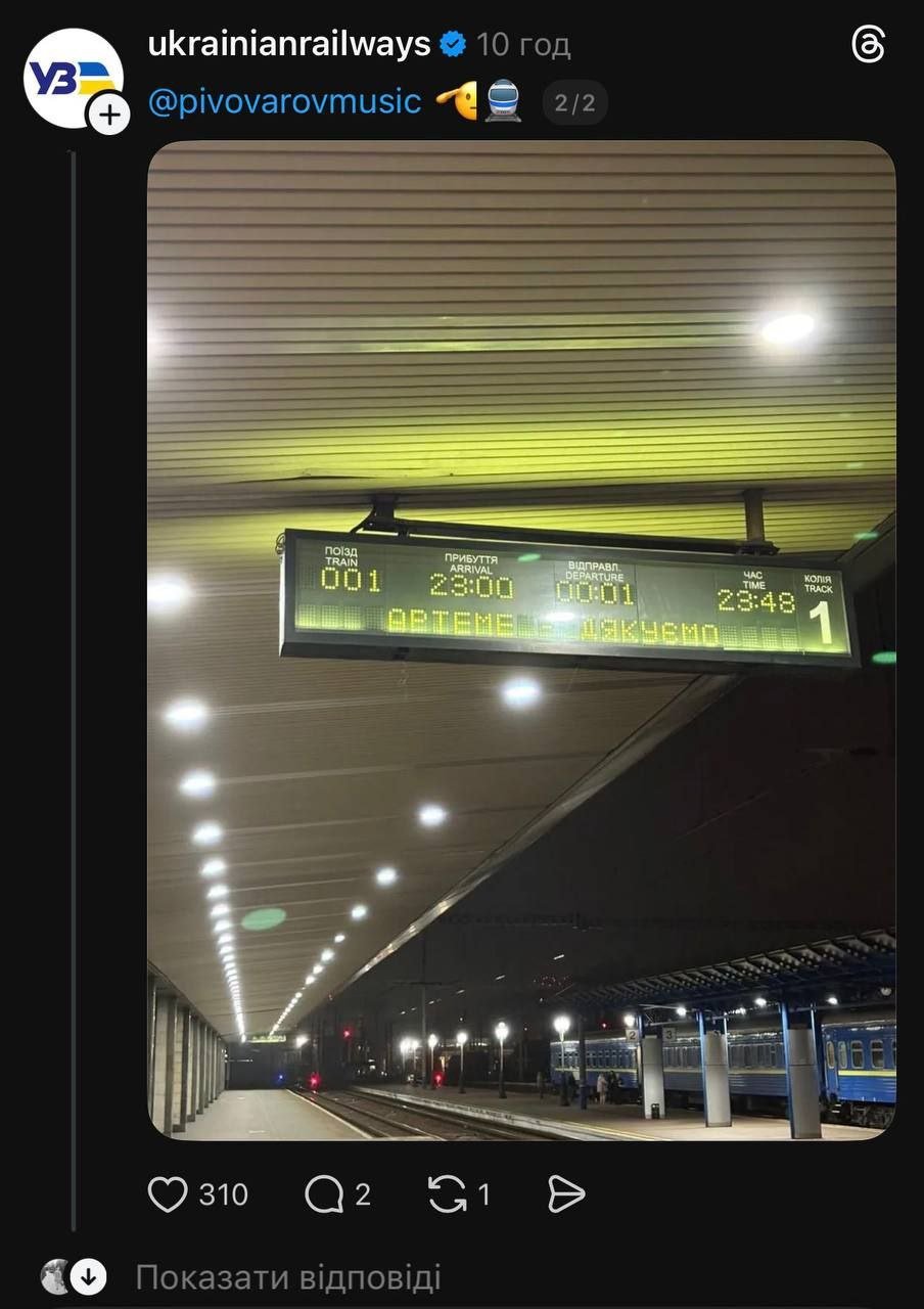 «Кажуть, чекати — нелегко. Але якщо вже @pivovarovmusic чекав нашого поїзда, то й ми, зачекаємо на Артема. Дякуємо Артеме, Ви ТОП!».