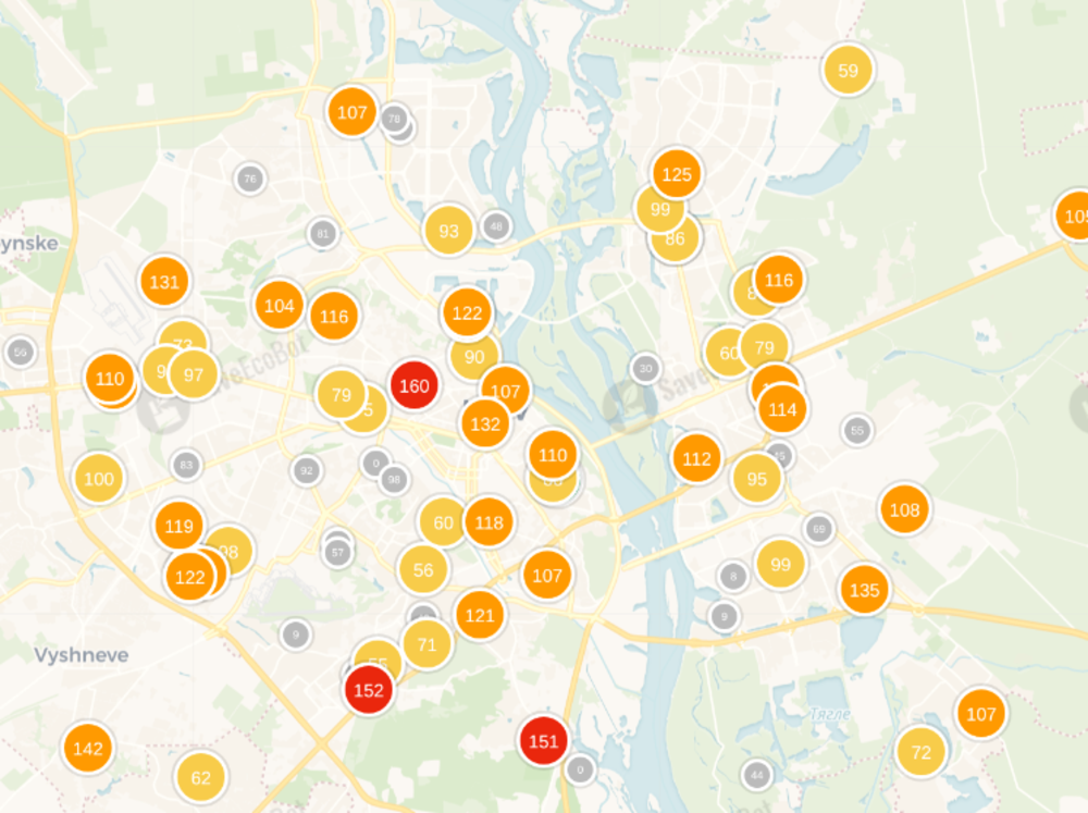 На Правому та Лівому берегах індекси якості повітря досягли небезпечного рівня, який може становити шкоду для здоров’я: