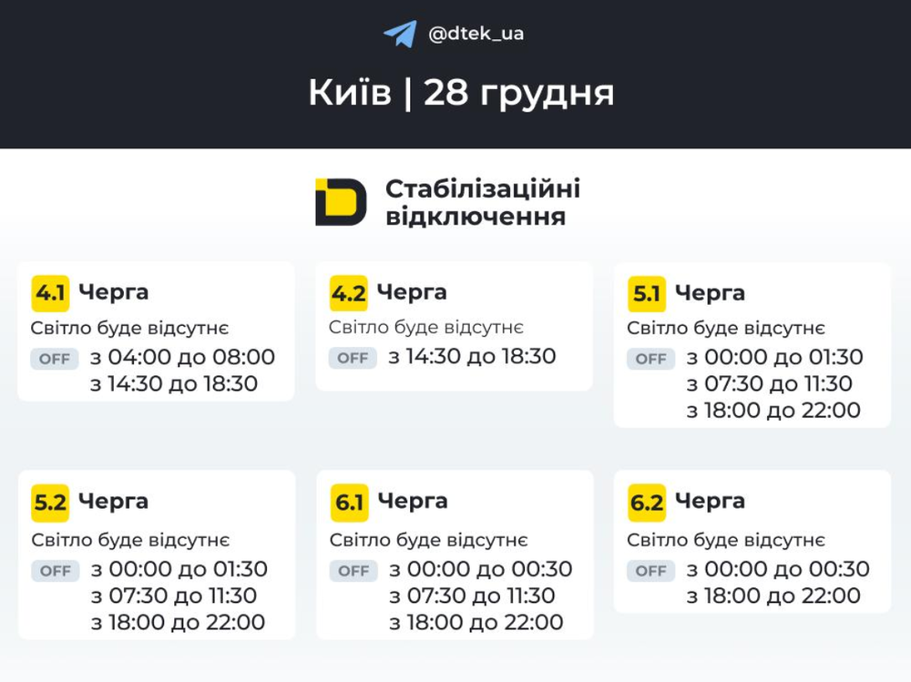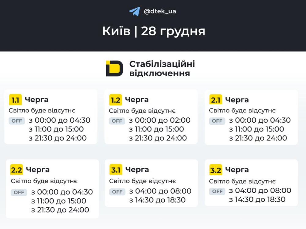Удень, 28 грудня, в Києві ввели погодинні графіки відключень світла. Про це повідомляє ДТЕК.
